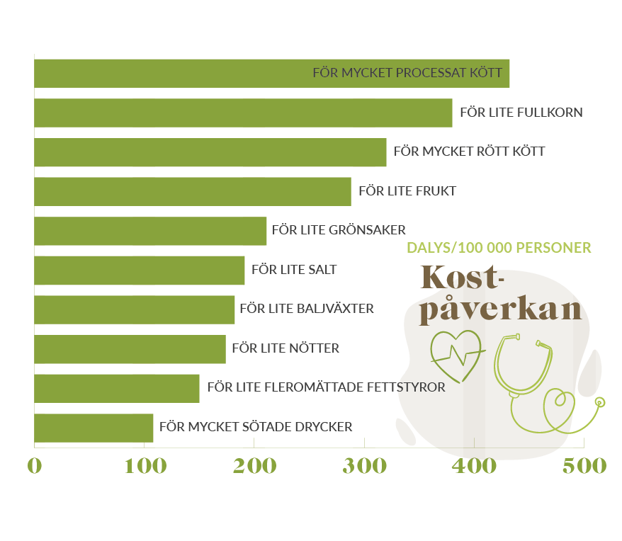 We need to eat more whole grains to live a long and healthy life. Whole grains top the list of foods we need to increase in our diet. This is shown by the Global Burden of Disease study. The chart illustrates the impact of various dietary factors on health. The figures represent years of life lost due to premature death or disability per 100,000 residents in Sweden in 2023. There are primarily three types of lifestyle-related diseases affected by insufficient whole grain intake: