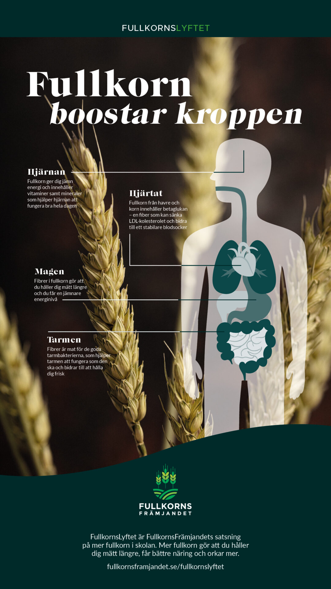 Att äta tillräckligt med fullkorn är otroligt viktigt för både maghälsa och total hälsa. I informationsmaterialet till skolorna har vi lyft på vilket sätt fullkorn boostar hela kroppen. Hjärnan, hjärtat, magen och tarmen mår alla bra av att vi äter ett varierat utbud av fullkornsprodukter.